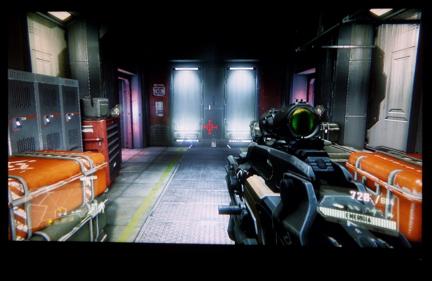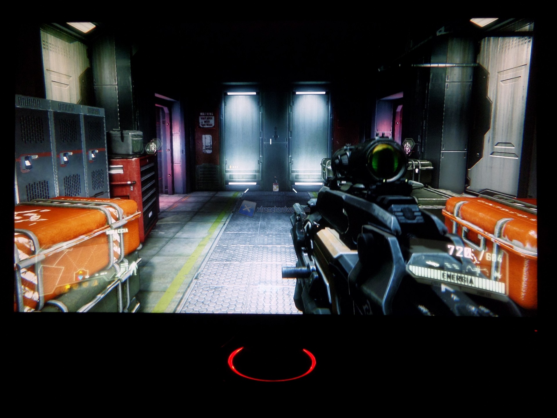Nella prima immagine che segue abbiamo attivato un tipo di mirino tramite la funzione GamePlus del menù OSD. Con l'arma selezionata in Crysis 3 il mirino non risulta particolamente preciso, ma quello offerto da ASUS aiuta non poco a prendere facilmente la mira. La luce rossa circolare proveniente dal LED posto sulla base non ha una forte intensità e appare come si vede in foto, ovvero non invasiva.