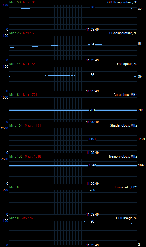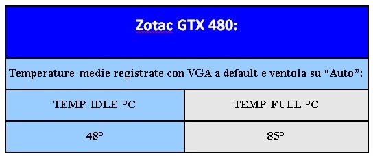 La ventola, se impostata manualmente a pieno regime, ovvero al 100%, a nostro avviso risulta insopportabile e  fastidiosa, mentre è praticamente inudibile fino al 60%. Abbiamo provato ad impostare manualmente la ventola al 60% e abbiamo visto che la Zotac GTX 480 lavora senza problemi con una temperature media che si aggira in torno agli 84° C. Riteniamo che questo sia il miglior compromesso Temperatura/silenziosità. Ricordiamo che tutti i test da noi condotti, sono stati fatti su un banchetto di prova, con temperatura ambiente media di 23.5° C.