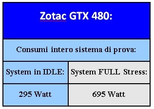 Dal punto di vista dei consumi, la sola GTX 480 consuma in full circa 285 Watt e in idle 105 Watt. Sono valori decisamente alti per una singola scheda video.