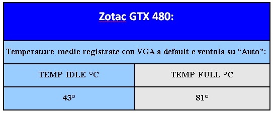 Abbiamo riprovato ad eseguire nuovamente i test, sempre su banchetto e con una temperatura media di 23,5° C. Dopo il nostro intervento,  la Zotac GTX 480 ha diminuito mediamente le  temperature  di circa 4° in full load e 5° in idle. In sostanza siamo arrivati ad ottenere questa situazione: